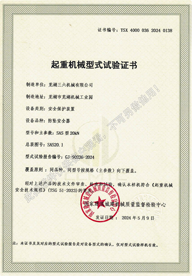 SAS型20kN防墜器型式試驗(yàn)證書
